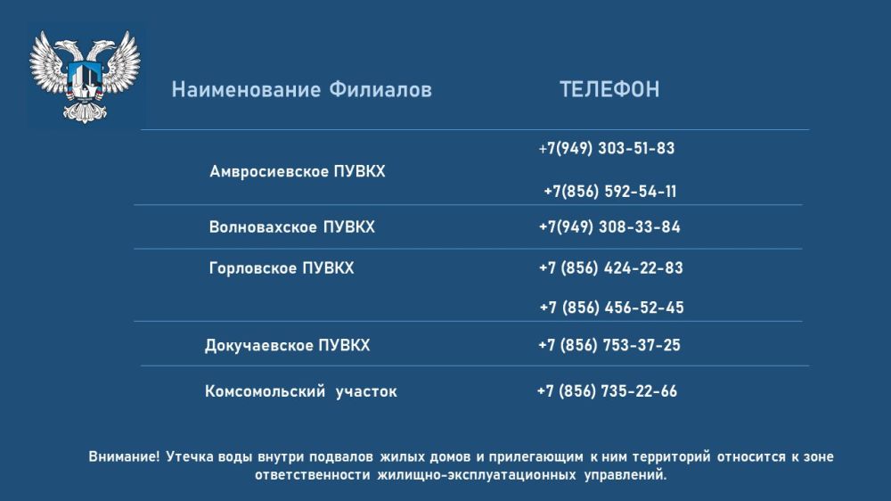В случае возникновения вопросов относительно перебоев в водоснабжении, порывов на сетях водоснабжения или водоотведения, графика подачи воды и т.д., жители Донецкой Народной Республики могут обратиться в местные диспетчерские службы филиалов предприятия «Вода Донбасса».