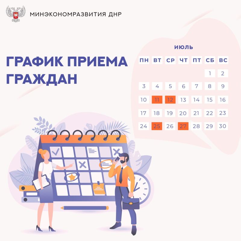 Сообщаем о датах приема граждан руководством Минэкономразвития ДНР в июле 2023 года: