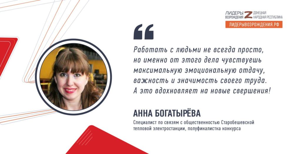 «Окончив магистратуру Донецкого национального университета, я более 11 лет работала заведующей отделом корреспондентов в редакции районной газеты "Новая жизнь". С 2017 года возглавляю пресс-службу Старобешевской тепловой электростанции. Также у меня есть большой опыт общественной работы. С 2015 года я активист общественного движения «Донецкая Республика», с 2022 года состою в партии "Единая Россия". Работать с людьми не всегда просто, но именно от этого дела чувствуешь максимальную эмоциональную отдачу, важность и значимость своего труда. А это вдохновляет на новые свершения!» – добавила Анна Богатырёва.