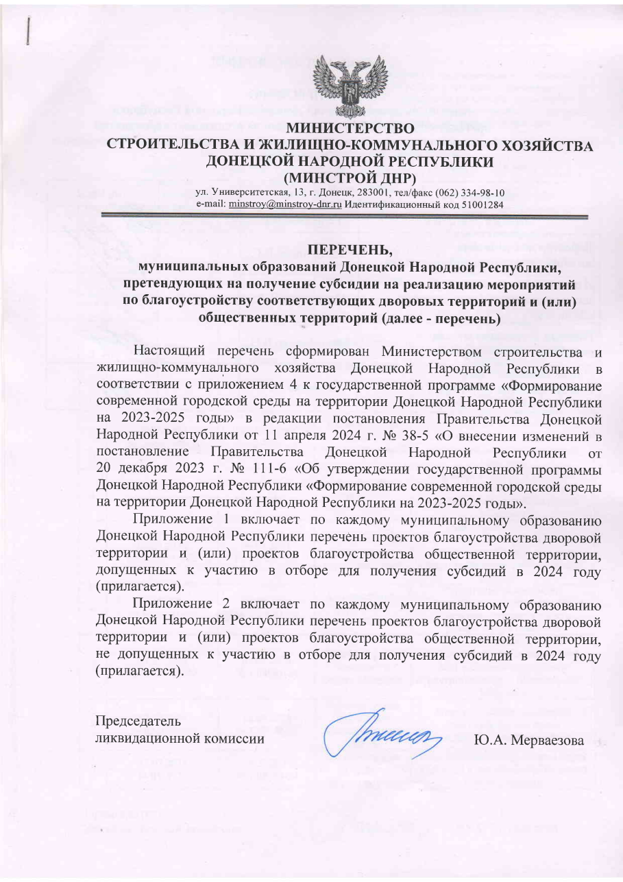 Министерство строительства и жилищно-коммунального хозяйства Донецкой Народной Республики публикует перечень проектов благоустройства общественной и дворовой территорий, допущенных к участию в отборе для получения субсидий в 2024 году.