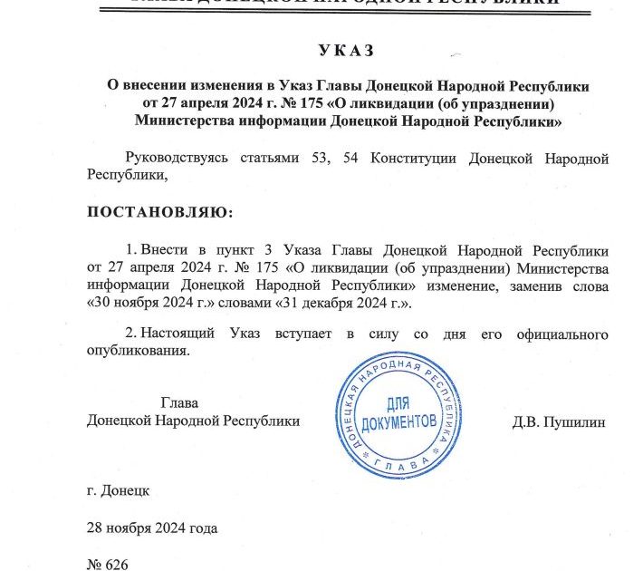 Указом Главы ДНР №626 от 28 ноября 2024 года внесено изменение в Указ Главы Донецкой Народной Республики от 27 апреля 2024 года №175 «О ликвидации Министерства информации Донецкой Народной Республики».