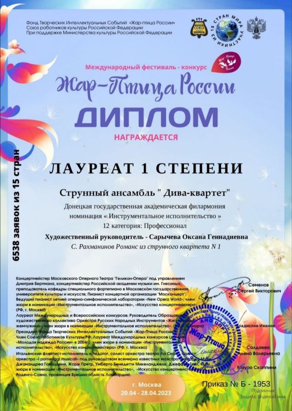 ЛАУРЕАТОМ МЕЖДУНАРОДНОГО ФЕСТИВАЛЯ-КОНКУРСА «ЖАР-ПТИЦА РОССИИ» СТАЛ «ДИВА-КВАРТЕТ» ДОНЕЦКОЙ ФИЛАРМОНИИЕще одна победа струнного ансамбля «Дива-квартет» Донецкой государственной академической филармони