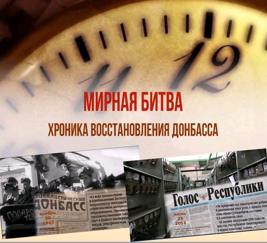 Предлагаем вашему вниманию культурно-просветительский проект «Мирная битва: хроника восстановления Донбасса», который представляет собой цикл видеороликов параллельно отображающих события восстановления районов и городов Донецкого края в годы Великой Отечественной войны (1943-1945) и возрождение промышленности, сельского хозяйства, инфраструктуры Донецкой Народной Республики, пострадавших в результате действий вооруженных формирований Украины (2015–2022).