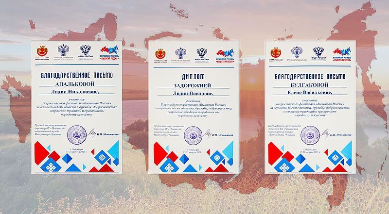 За особый вклад в сохранение культурных традиций народов России и активное участие во Всероссийском фестивале «Вышитая Россия» дипломами и благодарственными письмами от Главы Чувашской Республики Олега Николаева и директора Чувашского национального музея Ирины Меньшиковой награждены участники творческого коллектива проекта «Вышитая карта Донецкой Народной Республики».