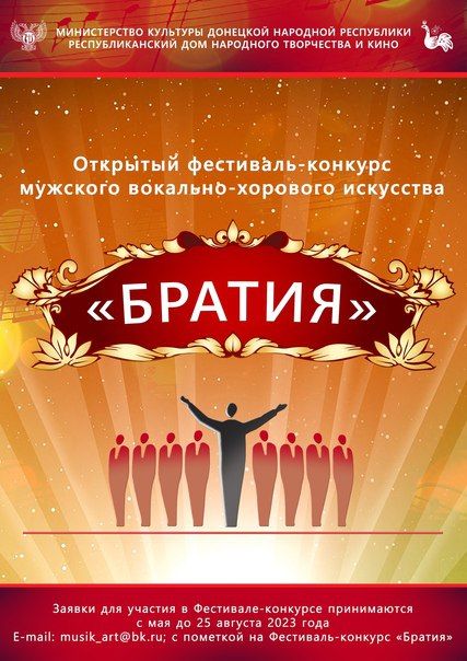 ПРОДОЛЖАЕТСЯ ПРИЁМ ЗАЯВОК НА ОТКРЫТЫЙ ФЕСТИВАЛЬ-КОНКУРС МУЖСКОГО ВОКАЛЬНО-ХОРОВОГО ИСКУССТВА «БРАТИЯ»Фестиваль-конкурс предусматривает отборочный тур на основании заявок городов/районов Донецкой Народ