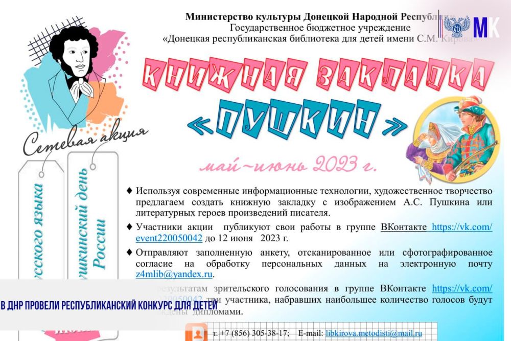В ДНР ПРОВЕЛИ РЕСПУБЛИКАНСКИЙ КОНКУРС ДЛЯ ДЕТЕЙКо дню русского языка и Пушкинскому дню России Донецкая республиканская библиотека для детей имени С