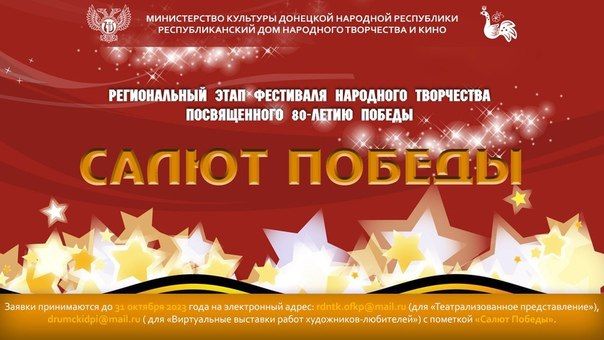 Принимаются заявки для участия в региональном этапе фестиваля народного творчества «Салют Победы», посвященного 80-летию Победы в Великой Отечественной войне 1941-1945 годов.