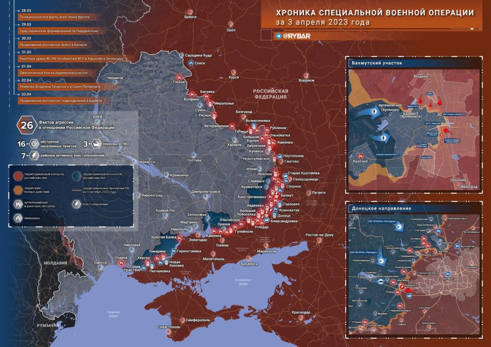 Хроника специальной военной операции за 3 апреля 2023 годаПриграничные территории:Беспилотники ВСУ сбросили взрывные устройства на здания военкомата и отдела МВД в Севском районе Брянской области