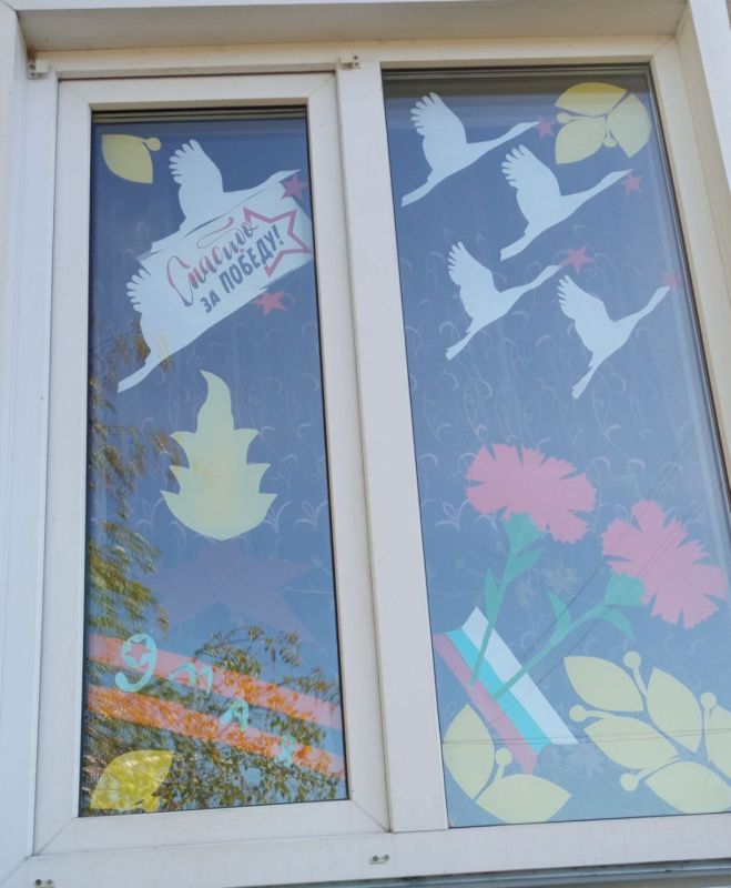 На окнах учебных заведений появились фотографии героев, поздравления с праздником, цветы и голуби мира. Таким образом учащиеся демонстрируют свое уважение и память о подвигах защитников Отечества.