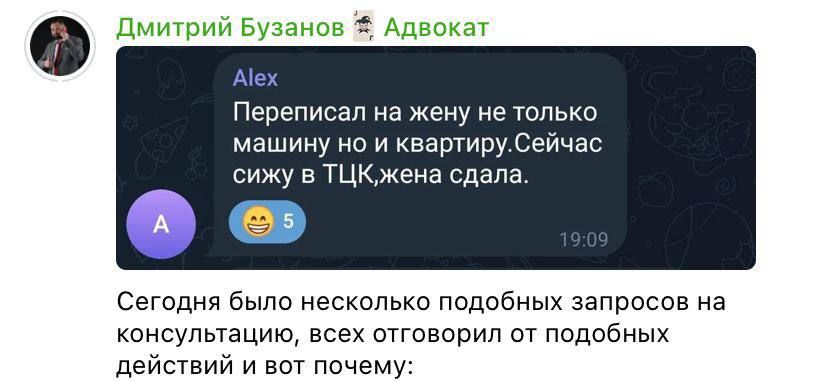 И вот произошло абсолютно неудивительное – украинский адвокат публикует скриншот от клиента, который переписал имущество на жену, а она его потом сдала в ТЦК…