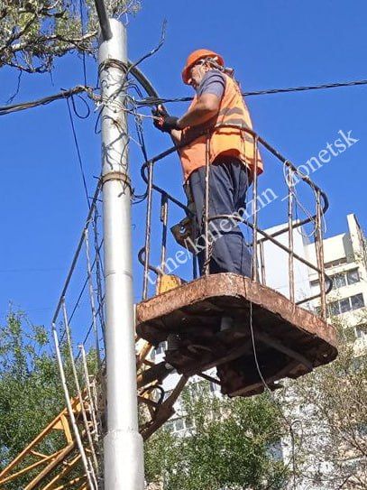 Сегодня сотрудники предприятия «Донецкгорсвет» выполняли замену ламп и кабеля, осуществляли ремонт светильников и пропилку деревьев, устраняли повреждения и неисправности, подключали и восстанавливали наружное освещение, перетягивали кабель.