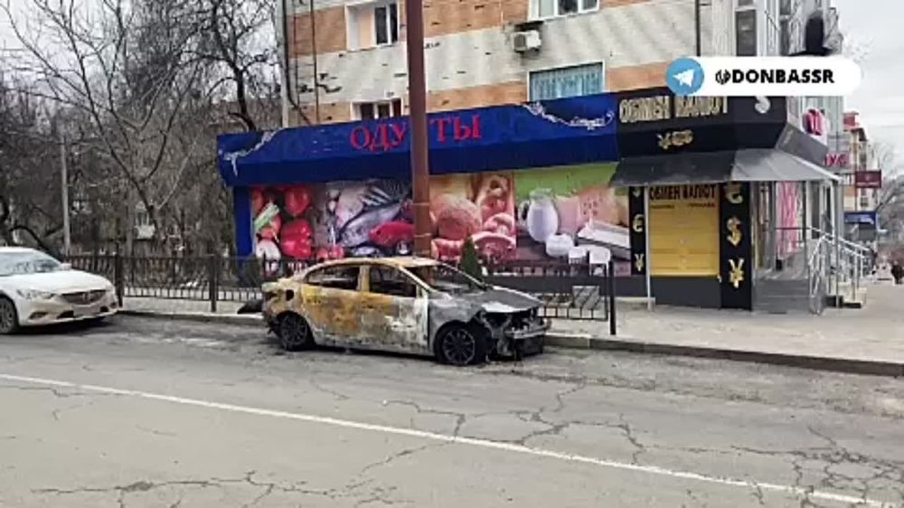 Сгоревший автомобиль в результате обстрела центра Донецка в новогоднюю ночь