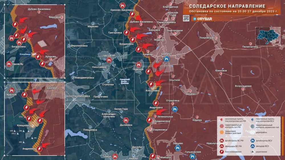 Соледарское направление: атаки ВС РФ к северо-западу от Бахмутаобстановка по состоянию на 20:00 27 декабря 2023 годаНа Соледарском направлении ВС РФ постепенно возвращают утраченные ранее позиции у Ба