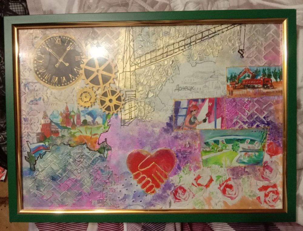 Многие участники разными способами говорят СПАСИБО шефам-регионам городов Республики, помогающим восстановить разрушенное войной. Лада решила выразить благодарность рисунком-коллажом с объемными элементами. Получилось очень необычно и притягательно.