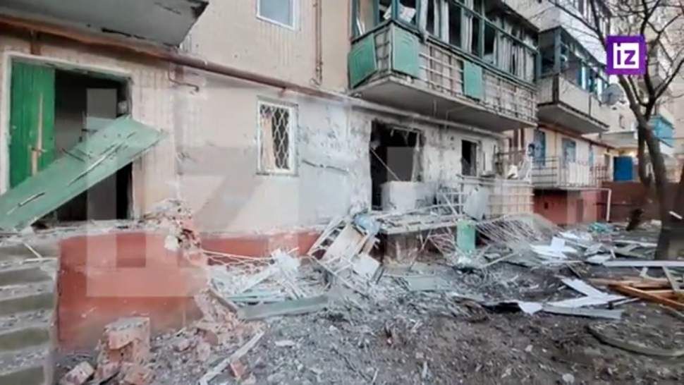 Позднее «Известия» показали последствия обстрела Горловки. На кадрах видны обрушения фасада жилого дома и выбитые из окон стекла.