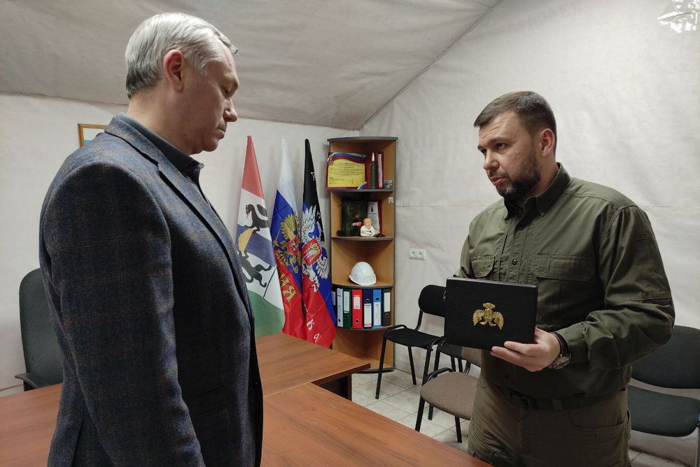 Денис Пушилин передал Звезду Героя ДНР, присвоенную погибшему бойцу, губернатору Новосибирской области Андрею Травникову