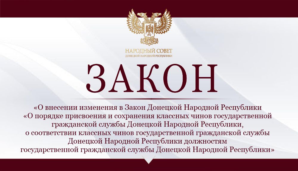 Закон «О внесении изменения в Закон Донецкой Народной Республики «О порядке присвоения и сохранения классных чинов государственной гражданской службы Донецкой Народной Республики, о соответствии классных чинов государственной гражданской службы Донецкой Народной Республики должностям государственной гражданской службы Донецкой Народной Республики» принят депутатами в двух чтениях в целом и вступает в силу со дня его официального опубликования.