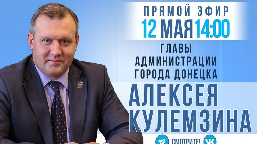 Глава администрации Донецка Алексей Кулемзин проведет прямую линию с жителями Донецка 12 мая в 14:00. Анонс будущего мероприятия мэр опубликовал в своем телеграм-канале.