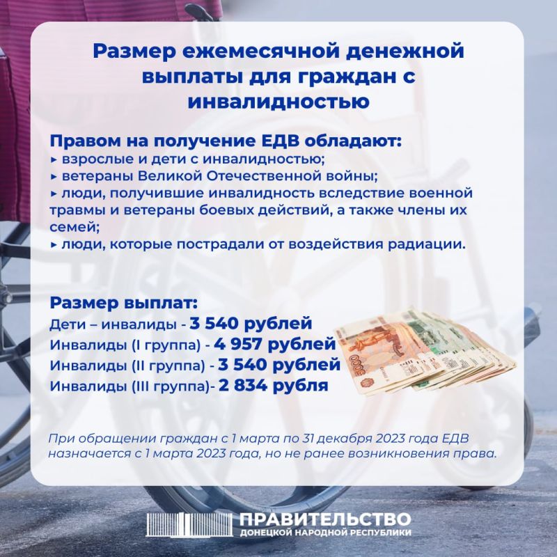 Размер ежемесячной денежной выплаты для граждан с инвалидностью Ежемесячная денежная выплата устанавливается россиянам, иностранцам и лицам без гражданства, которые постоянно живут на территории Донец