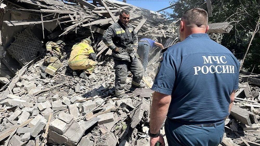 Спасатели продолжают разбирать завалы дома в Петровском районе Донецка, разрушенного обстрелом ВСУ 9 августа