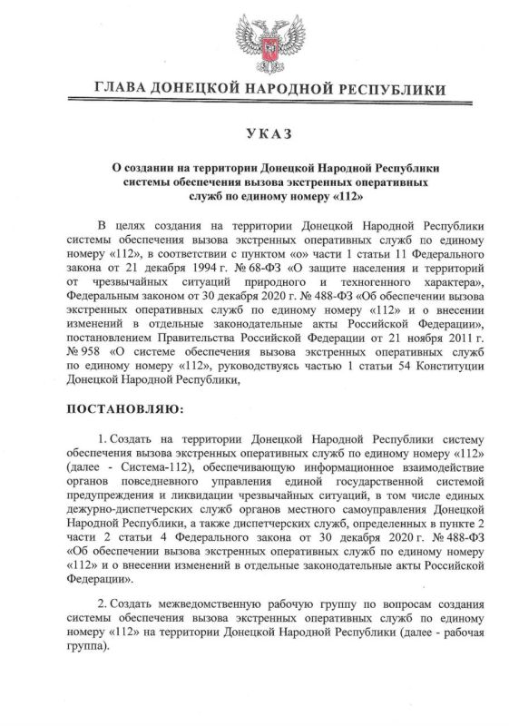Указом врио Главы ДНР №368 от 22 сентября 2023 года на территории Донецкой Народной Республики создана система обеспечения вызова экстренных оперативных служб по единому номеру 112