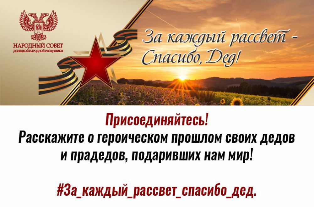 Народный Совет Донецкой Народной Республики продолжает ежегодный проект «За каждый рассвет – Спасибо, Дед!», который приурочен Дню Великой Победы