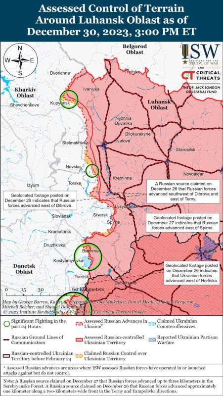 Российские войска подтвердили наступление в районе Кременной и 30 декабря продолжили бои с ВСУ вдоль линии Купянск-Сватово-Кременная. Видео с геолокацией от 29 декабря показывает, что российские войска продвинулись к западу от Диброва (юго-западнее Кременной).