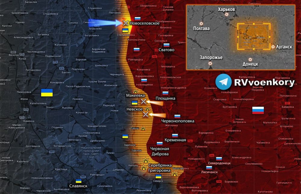 - На Купянском направлении ВСУ под российскими ударами в районах н.п. Двуречная, Ивановка, Купянск, Кисловка, Котляровка, Крахмальное и Песчаное Харьковской области и Новоселовское и Стельмаховка ЛНР.