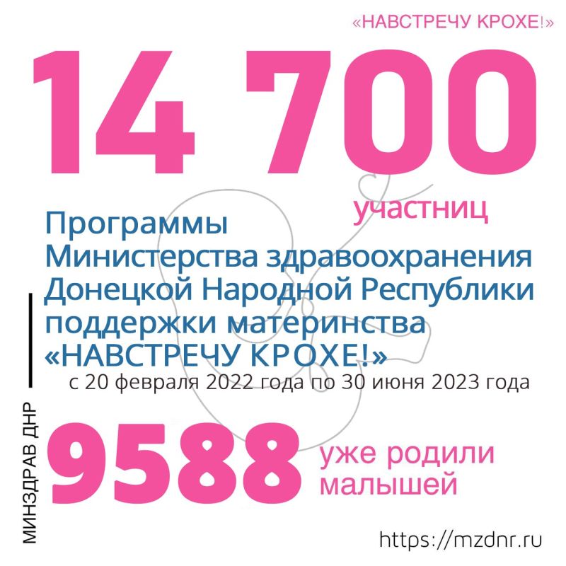 За период с 20 февраля 2022 года по 30 июня 2023 года в рамках проекта ЕР "Крепкая семья" и реализации Программы Министерства здравоохранения Донецкой Народной Республики поддержки материнства «НАВСТРЕЧУ КРОХЕ!» 14 700 женщин стали участницами Программы, из которых 9588 уже стали мамами.