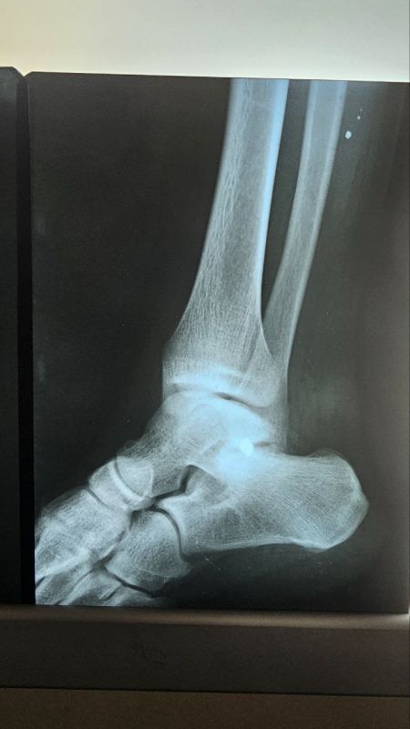 Прибывшая бригада скорой медицинской помощи госпитализировала юношу с несколькими травмами. Врачи поставили диагноз минно-взрывная травма, осколочное ранение головы, осколочное ранение нижней трети правой голени с повреждением ахиллова сухожилия, открытый краевой перелом правой таранной кости и обнаружили инородное тело (осколок), застрявшее в области правого голеностопного сустава.