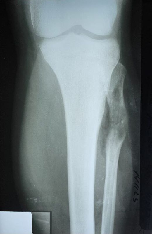 Опухоль выдавила малоберцовую кость и разорвала соединение большеберцовой и малоберцовой костей.