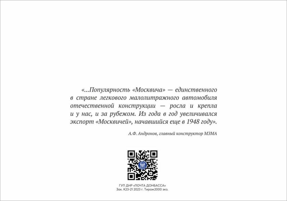 Представляем выпуск, посвященный легенде. На виньетках запечатлены наиболее популярные модели бренда: «400», «408», «407», «2141», «412» и «3». Тираж каждой виньетки и, соответственно, малого листа — 2000 экз.