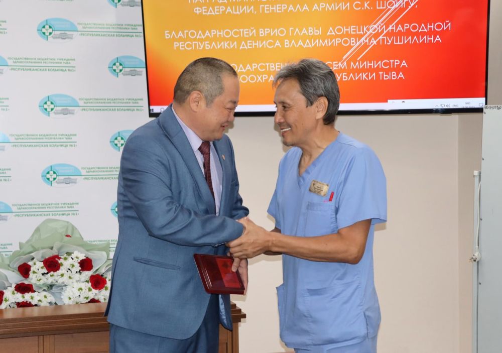 Награждение медицинских работников, которые выезжали на новые российские территории и оказывали медицинскую помощь населению, ДНР, ЛНР и Херсонской области. Сердечно поздравили награжденных и вручили награды министр здравоохранения Тувы Анатолий Югай и Депутат Государственной Думы Айдын Сарыглар.