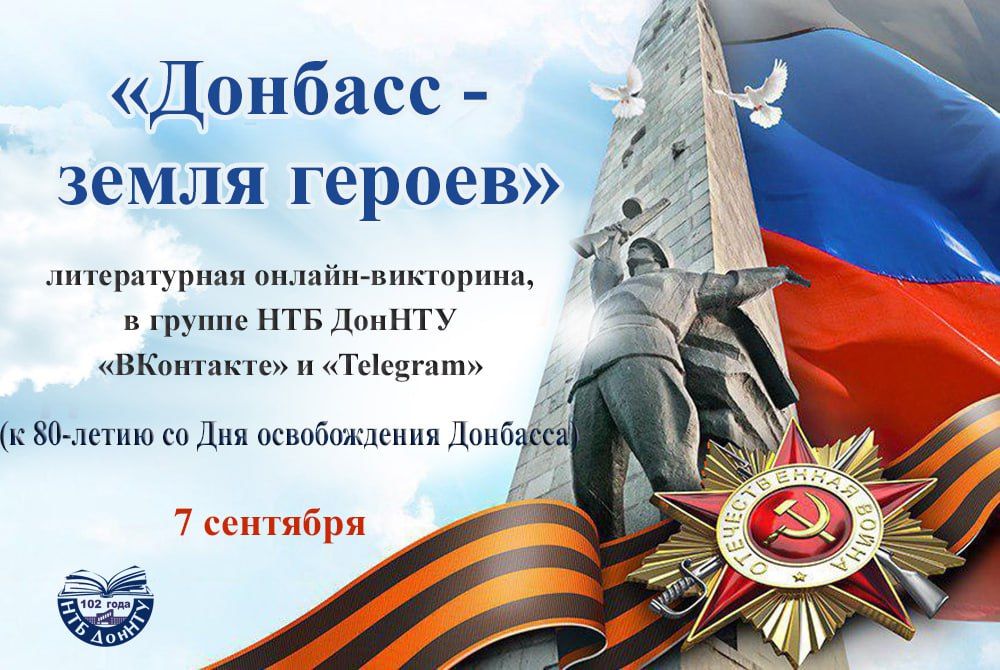 8 сентября исполняется 80 лет со дня освобождения Донбасса от фашистских захватчиков. К этой знаменательной дате научно-техническая библиотека Донецкого национального технического университета подготовила литературную онлайн-викторину «Донбасс – земля героев», которая пройдёт 7 сентября в группах НТБ «ВКонтакте» и «Телеграм».