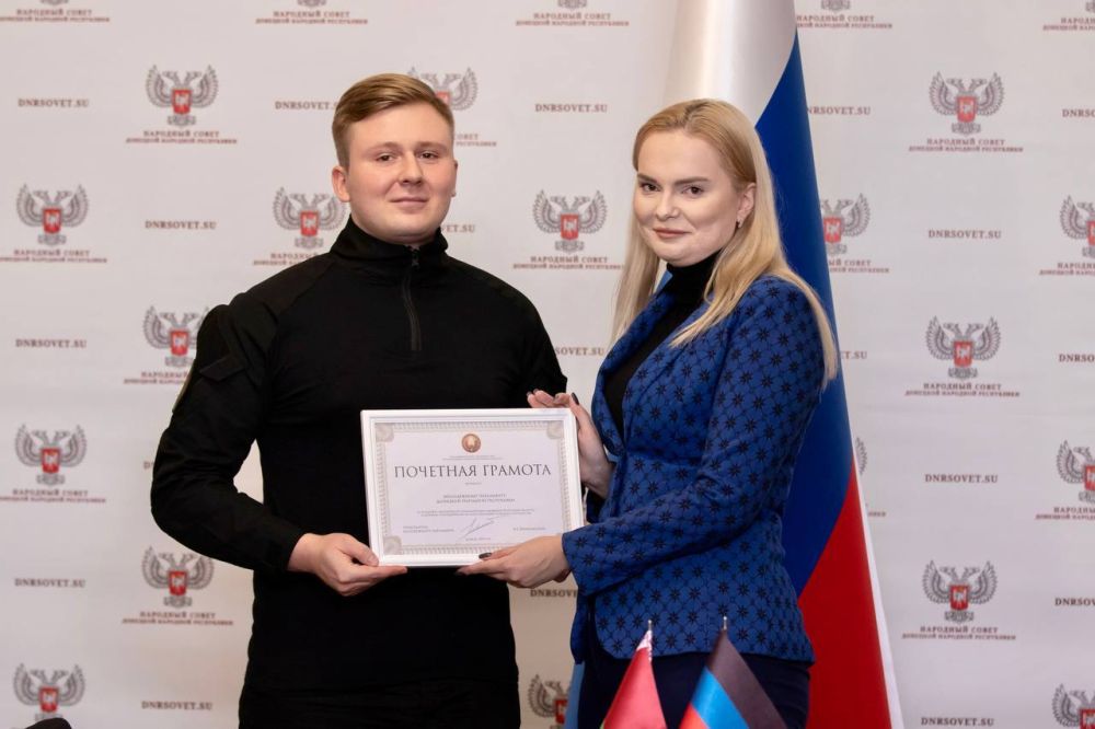 Почетная грамота Молодежного парламента при Национальном собрании Республики Беларусь вручена Молодежному парламенту Донецкой Народной Республики 4 ноября 2023 года в городе Донецке в День народного е