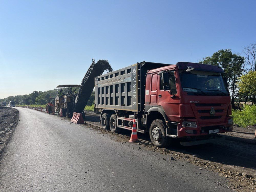 "В направлении АПП "Успенка" силами подрядных организаций Госкомпании "Автодор" выполняется ремонт участка трассы "Донецк - Харцызск - Амвросиевка - до границы Ростовской области".