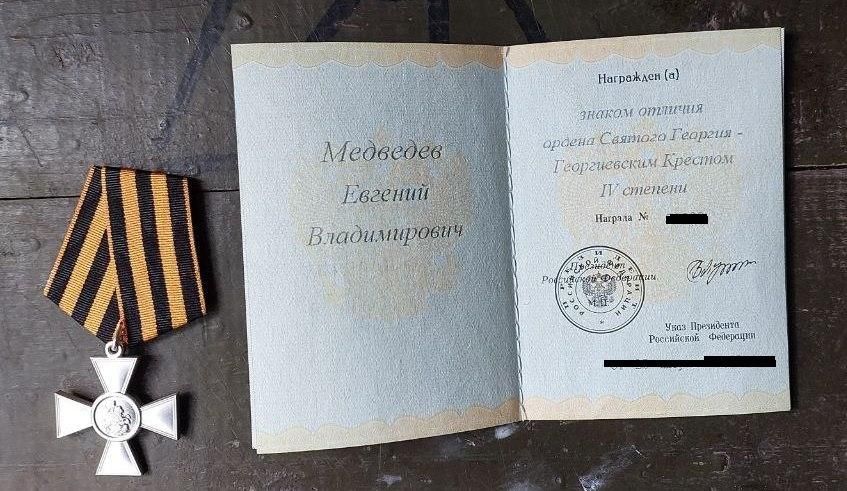 За успешное выполнение боевого задания участник специальной военной операции Евгений Медведев был награжден знаком отличия ордена Святого Георгия — Георгиевским крестом IV степени.