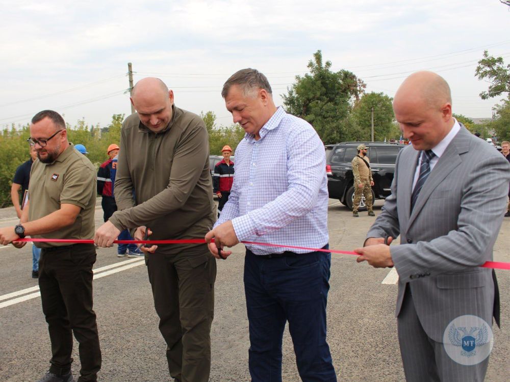 Торжественно перерезали ленточку и открыли движение по восстановленному мосту Заместитель Председателя Правительства Российской Федерации Марат Хуснуллин, Председатель Правительства Донецкой Народной Республики Евгений Солнцев, Министр транспорта ДНР Владимир Тужилин, руководитель проекта ООО "ЕвроТрансСтрой" Алексей Зубенко.